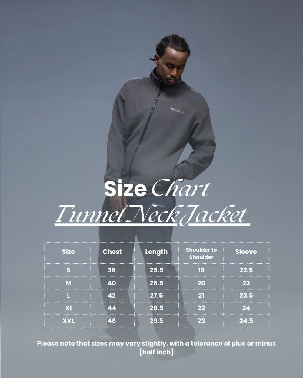 | SIZE | WIDTH | LENGTH | SHOULDER TO SHOULDER | SLEEVE LENGTH |
